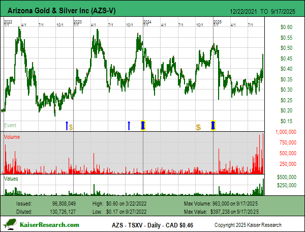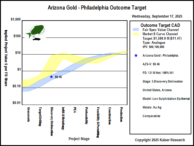 Arizona Gold & Silver Inc released assays for hole #156 on September 17, 2025 which yielded 20.43 m of 9.04 g/t gold and 34 g/t silver, about 13 meters after adjusting for the estimated 64% true width of the intersection. The section indicates this hole is the strongest yet in this vertical portion of the vein and that grade and thickness are improving at depth. It does include a 45 g/t interval over about a meter. On August 14 Arizona Gold had published a brief visual description of the vein mineralogy that hole #156 had intersected, and noted a transition from the rock type in the upper portion which was typical of the vein in the upper 300 m of the Philadelphia vein that drilling has tested along a strike of about 1,500 m, to a different rock type that resembles the vein host rock at the United Eastern vein in the Oatman district to the south which yielded 1.5 million ounces at an average grade of 28 g/t, considerably better than the 4-8 g/t we might expect from past drilling of the Philadelphia vein. On August 20, 2025 I asked, Is Arizona Gold poised for game changer assays?, pointing out that if the Philadelphia vein is indeed transitioning to Oatman style mineralogy with evidence of the boiling zone, the next 300 m of down dip extension would represent a major upward shift in the potential outcome target for the project, from a 500,000 oz underground mineable prize for the upper 300 m of Philadelphia to a target of 1-2 million ounces at a substantially better grade for the lower 300 meters. The stock did gain $0.105 to $0.46 on 2,023,260 share volume, but that seems a rather muted response to the results. Why was there not a much better response? Why has the stock price not erupted into S-Curve territory for a CAD $1.5 billion target outcome?